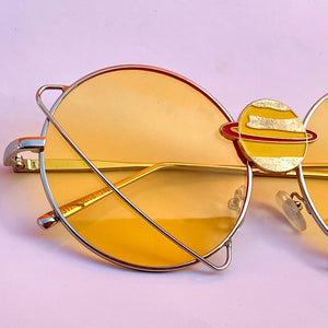 Complete your look in these cute accent shades featuring a shimmering yellow-gold psychedelic Saturn planet centerpiece charm adorning a lovely transparent yellow Saturn shaped sunglasses frame!